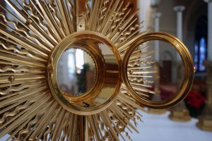 The monstrance and luna are sacred vessels, like the chalice and paten, used in liturgical celebrations at the Basilica of Saints Peter and Paul. The monstrance is a decorative circular stand constructed of metal designed to hold the consecrated host. The host itself — the wafer that represents the body of Christ — is displayed in a glass-enclosed centerpiece called the luna.