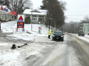 A vehicle crashed Tuesday morning on top of the interchange bridge at Exit 80 on the Maine Turnpike as a mix of snow, freezing rain, and sleet created difficult driving conditions across Maine.