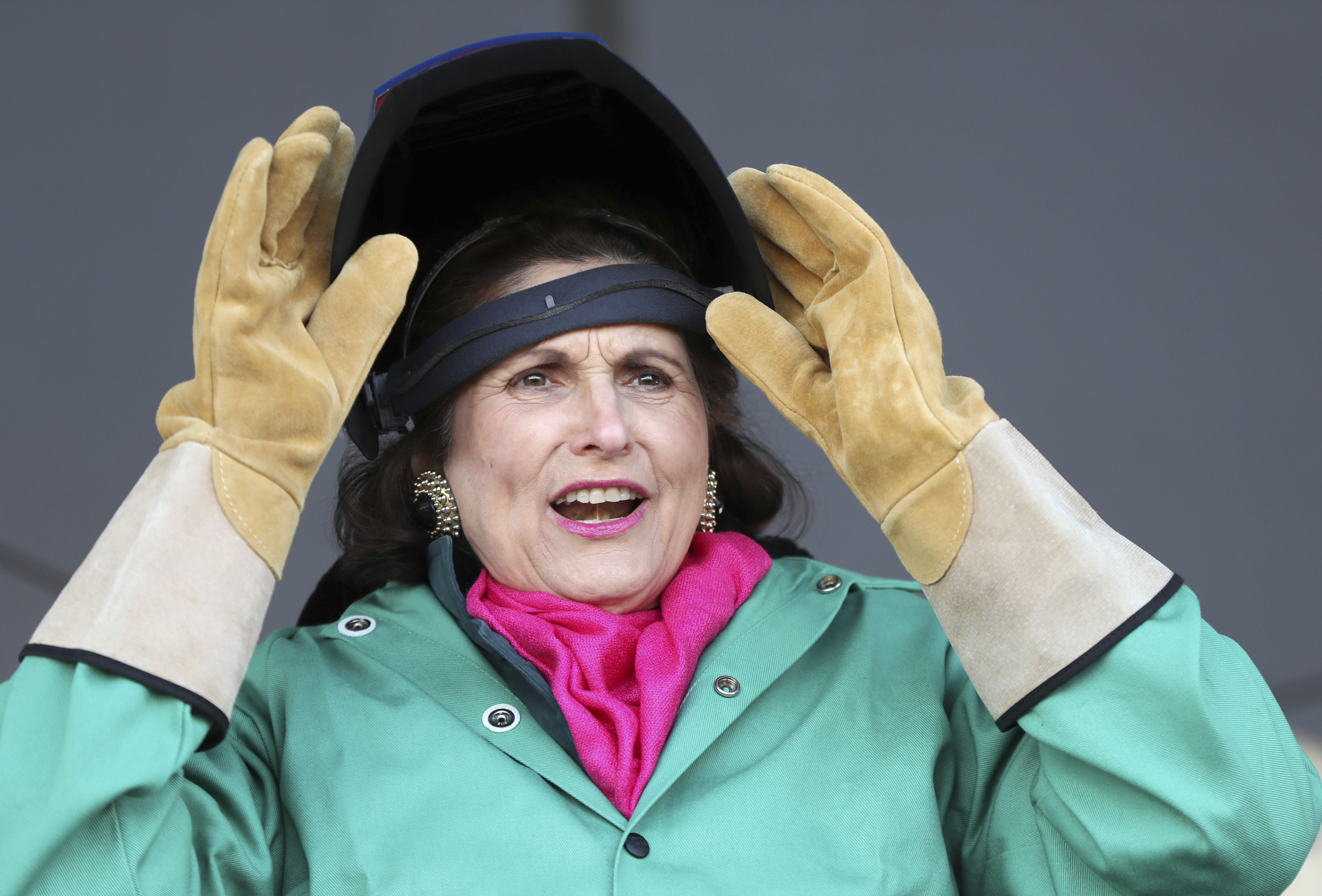 Wearing welder helmets, Lynda Bird Johnson Robb and Luci Baines Johnson were assisted by shipbuilder Timothy Trask in welding signatures on a steel plate during a keel-laying at the ceremony at Bath Iron Works.