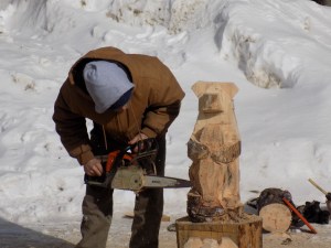 Chainsaw sculptor John Arsenault drew a crowd as he began working on a large piece of wood. In just a few minutes, the outline of a bear holding a fish was recognizable.