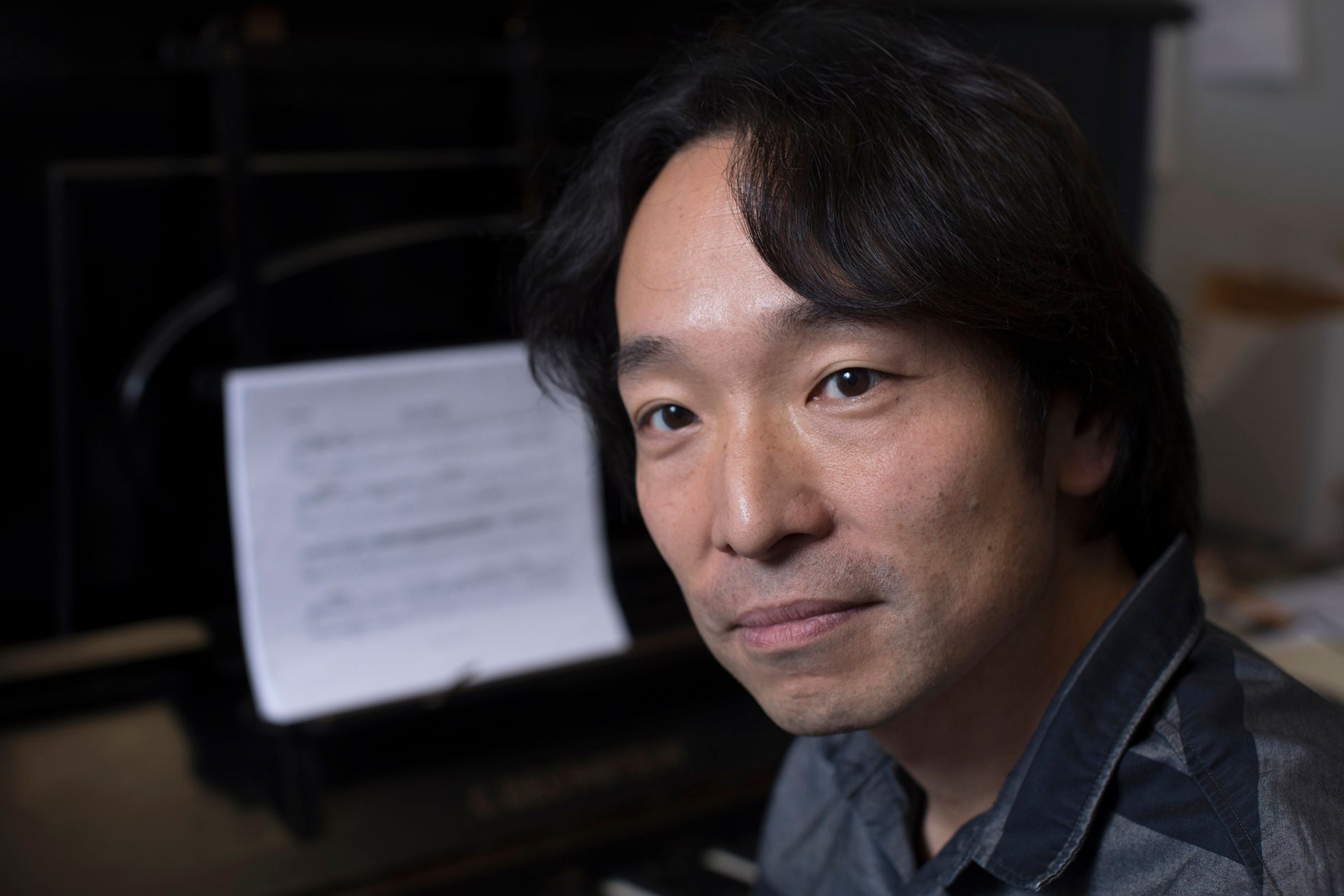 This piece (it is on the piano behind him) is titled ‘Open Passage.’ Itís a piece I wrote in memory of my friend Andrew Svoboda (he was of Czech origin) who was a very young, talented composer who died suddenly at the age of 26. Itís a very special piece for me. The piece itself is about 10 years old.Associate Professor of Music Hiroya Miura in his Olin Arts Center office.