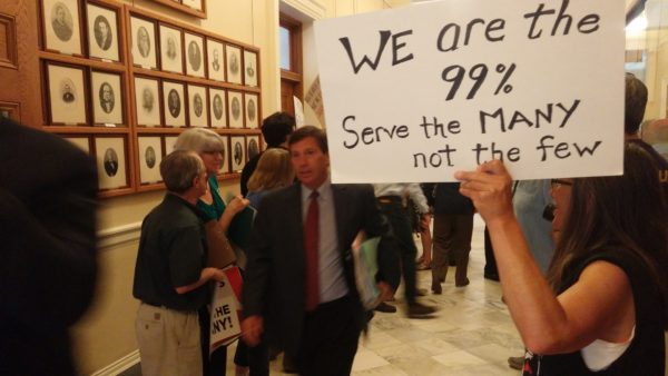 Republican House Minority Leader Ken Fredette of Newport makes his way to the House floor through a throng of protesters at the State House on Tuesday, June 27, 2017.