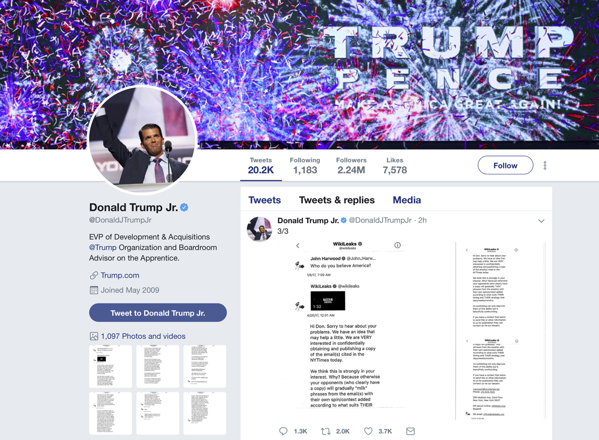 In one message dated Oct. 3, 2016, the WikiLeaks Twitter account sent Trump Jr. an article that included critical comments Clinton had made about WikiLeaks editor Julian Assange and said “it’d be great if you guys could comment on/push this story.”