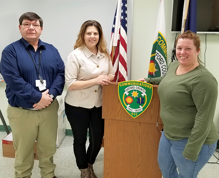 Oxford County Regional Communications Center Director James Miclon, left, recently announced that Tammy Maurer of Waterford, center, was hired as the communications center’s newest full-time dispatcher. Maurer will spend the next few months training at the center and at the Maine Criminal Justice Academy in Vassalboro. Designated dispatch trainer Beverly Stevens, right, will guide her through the training process. (Submitted photo)