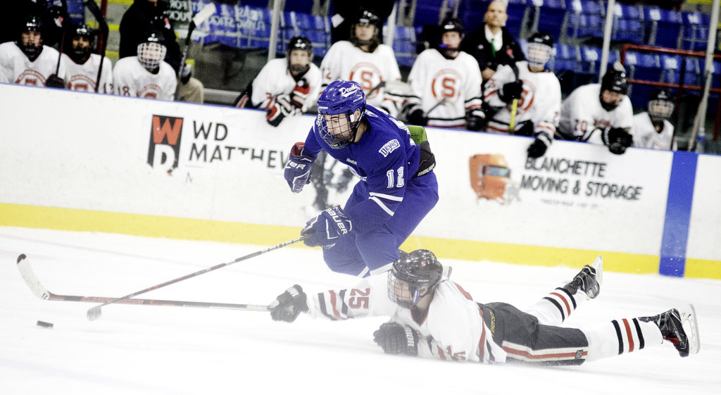 Kevin Woods of Scarborough attempts to stop Lewiston’s Cam Dionne from a break away during the second period in Lewiston on Saturday. (Daryn Slover/Sun Journal)