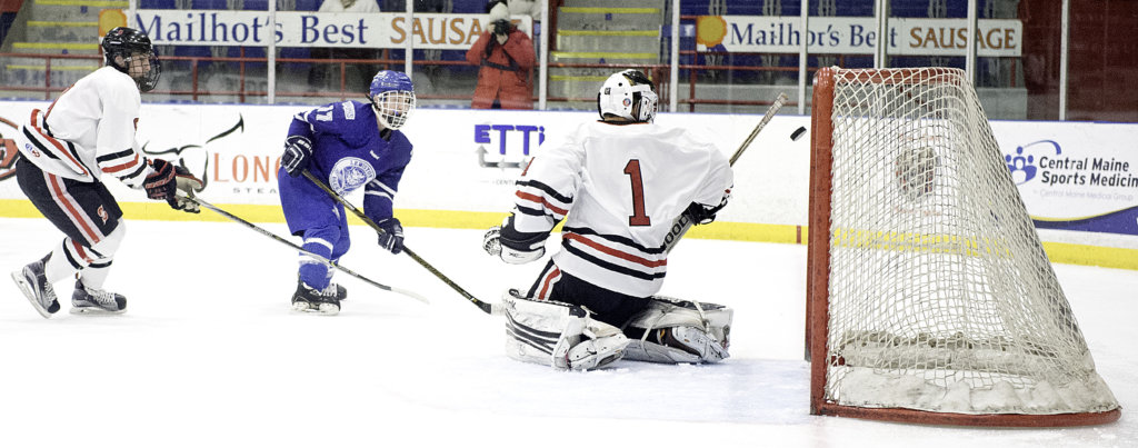 Scarborough goalie Brandon Wasser deflects a shot on goal by Gunnar Wade during the first period in Lewiston on Saturday. (Daryn Slover/Sun Journal)