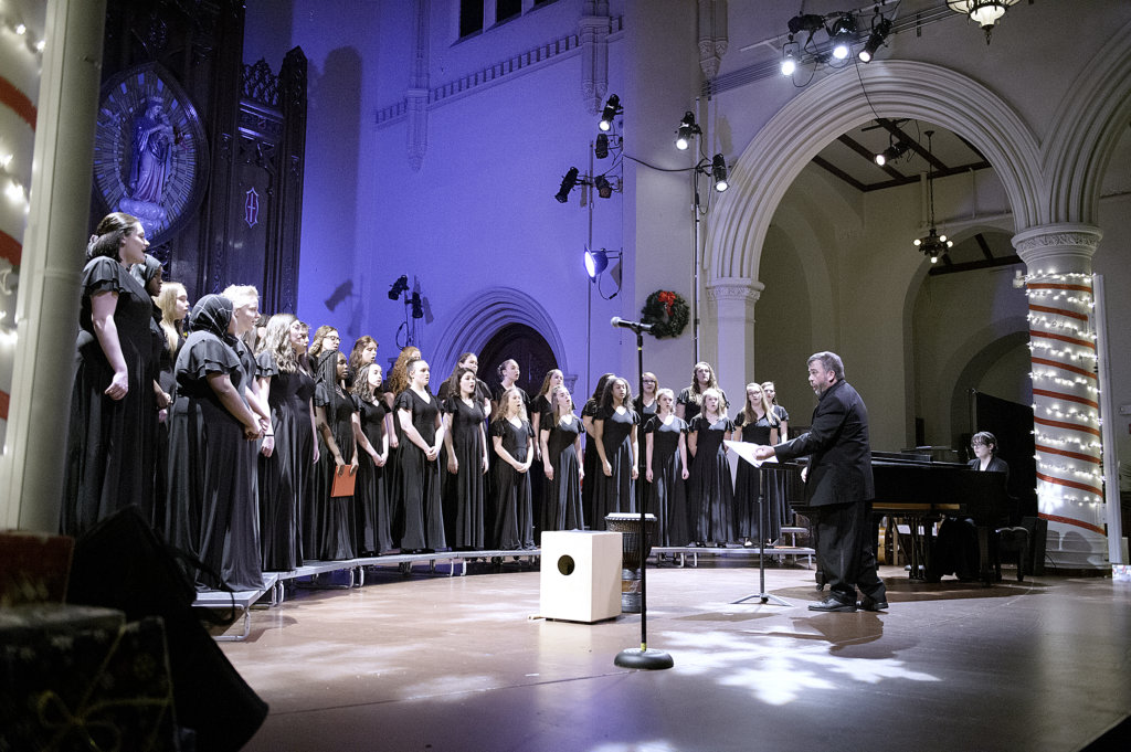 The Lewiston High School treble choir performs under Darren Avery during the Lewiston Vocal Music Department’s “Sounds of the Season” concert at the Gendron Franco Center in Lewiston on Tuesday. (Daryn Slover/Sun Journal)