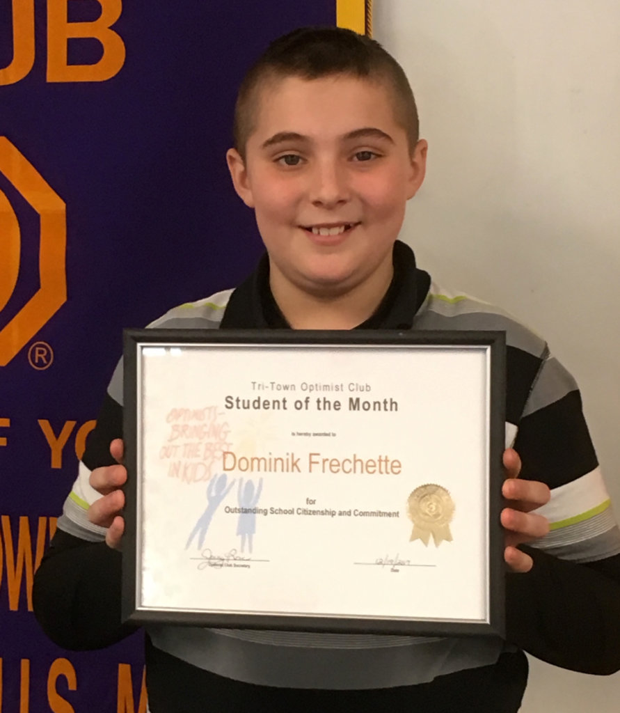The Mechanic Falls, Minot and Poland Tri-Town Optimist Club has announced its RSU 16 Student of the Month recipient, Dominik Frechette, sixth grade, Elm Street School. Frechette’s teacher describes him as an outstanding citizen and role model who continually gives of his time to make his school community a better place. His manners, initiative and helpful volunteering spirit are recognized, not only in his classroom and grade level, but also by the many adults who interact with him throughout the school on a daily basis.