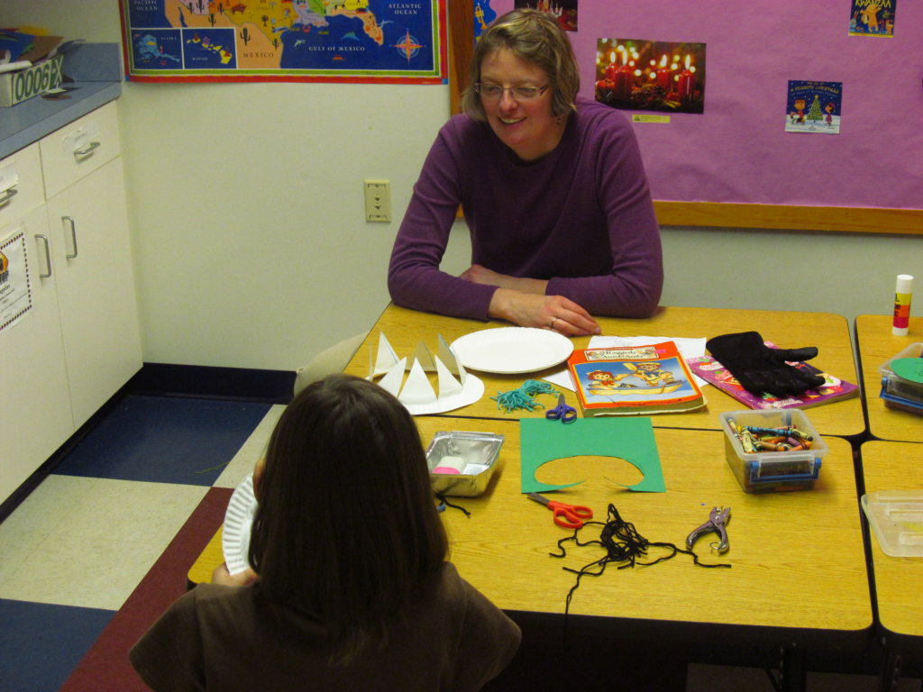 Annika Black (back), the children services librarian at Norway Memorial Library, assists a student from Guy E. Rowe Elementary School with making noisemakers and other New Year’s Day decorations during the library’s monthly “Wacky Wednesday” series. Black explained that once a month, she invites students to the library on the last Wednesday of the month to participate in a take-home activity.
