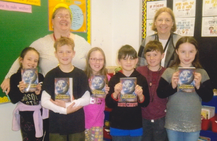 Two members of West Minot Grange 42, Hester and David Gilpatric, presented the 24th edition student dictionaries to the third-graders at Minot Consolidated School. In front from left are students Kadi Adams-Brossman, Eliot Rioux, Aubrey Fortin, Nathan Bragdon, Liam Davis and Brooklin Pratt; and, back, teachers Jen French and Linda Bernier.