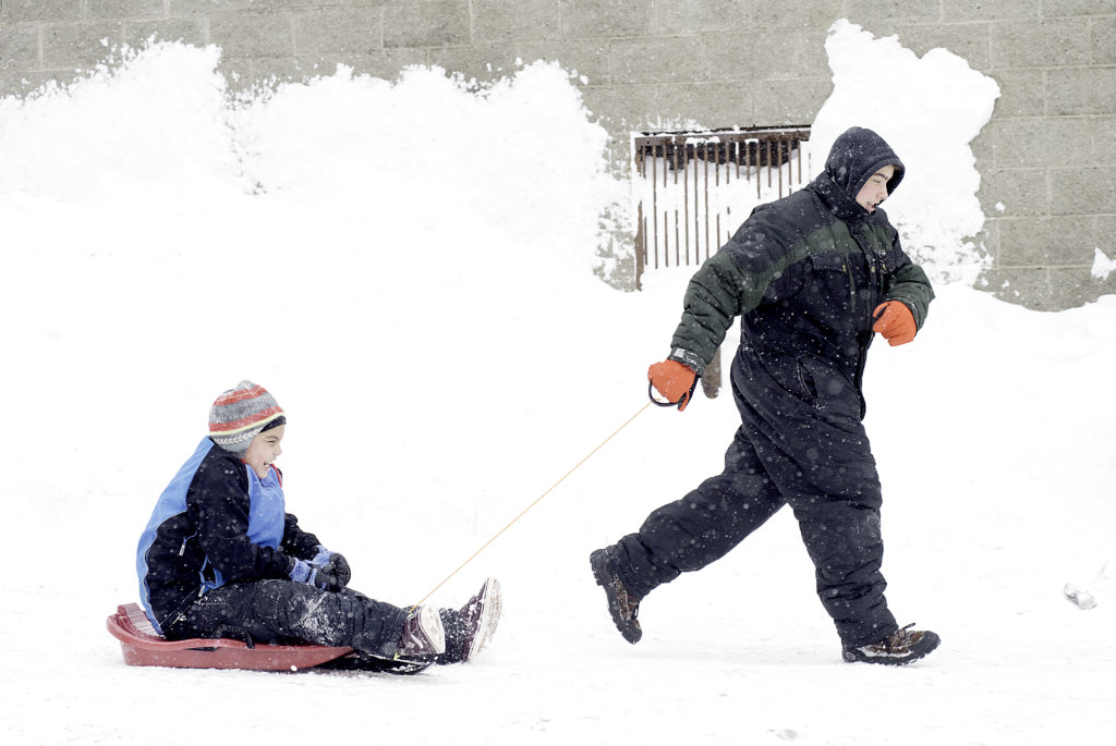 Bruce Griggs, 14, pulls his brother, Steven, 10, down a hill at the Hope Haven Gospel Mission in Lewiston on Friday. “As long as we don’t have school, it’s OK,” Bruce Griggs said about the cold and snow this winter. (Daryn Slover/Sun Journal)