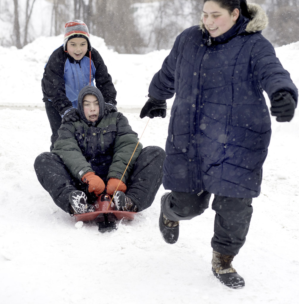 Chianne Griggs, 15, pulls her brothers, Steven, 10, and Bruce, 14, down a hill at the Hope Haven Gospel Mission in Lewiston on Friday. “As long as we don’t have school, it’s OK,” Bruce Griggs said about the cold and snow. (Daryn Slover/Sun Journal)