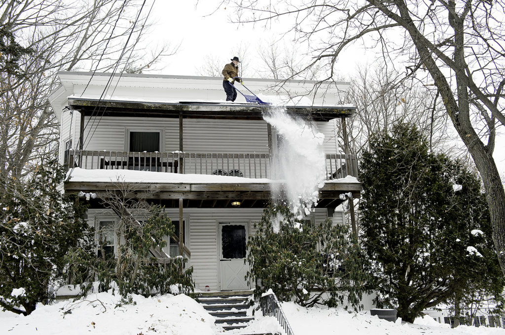 John St. Hilaire shovels snow from the roof of an apartment building on Franklin Street in Lewiston on Monday. “Everyone is worried about the rain coming in on Friday,” said St. Hilaire of State Roofing Company. The forecast is calling for up to a half-inch of rain in the Twin Cities area Friday. (Daryn Slover/Sun Journal)