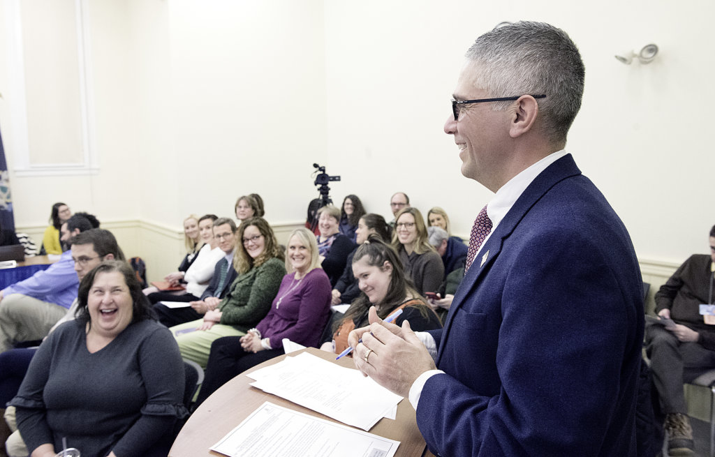 Lewiston Assistant Superintendent Shawn Chabot shares a lighter moment with the Lewiston School Committee on Monday. (Daryn Slover/Sun Journal)