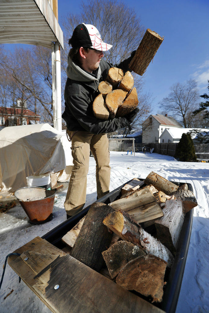 Corbin Chamberlain, 16, loads up on firewood to carry indoors, Saturday, Feb. 3, 2018, in Mechanic Falls, Maine. One firewood dealer says the average wait time for delivery of kiln-dried wood in the winter is usually about two weeks, but this year it’s seven weeks. Experts say thousands of Maine residents were caught off guard by a warm fall that caused firewood customers to delay getting in their winter supplies. (AP Photo/Robert F. Bukaty)