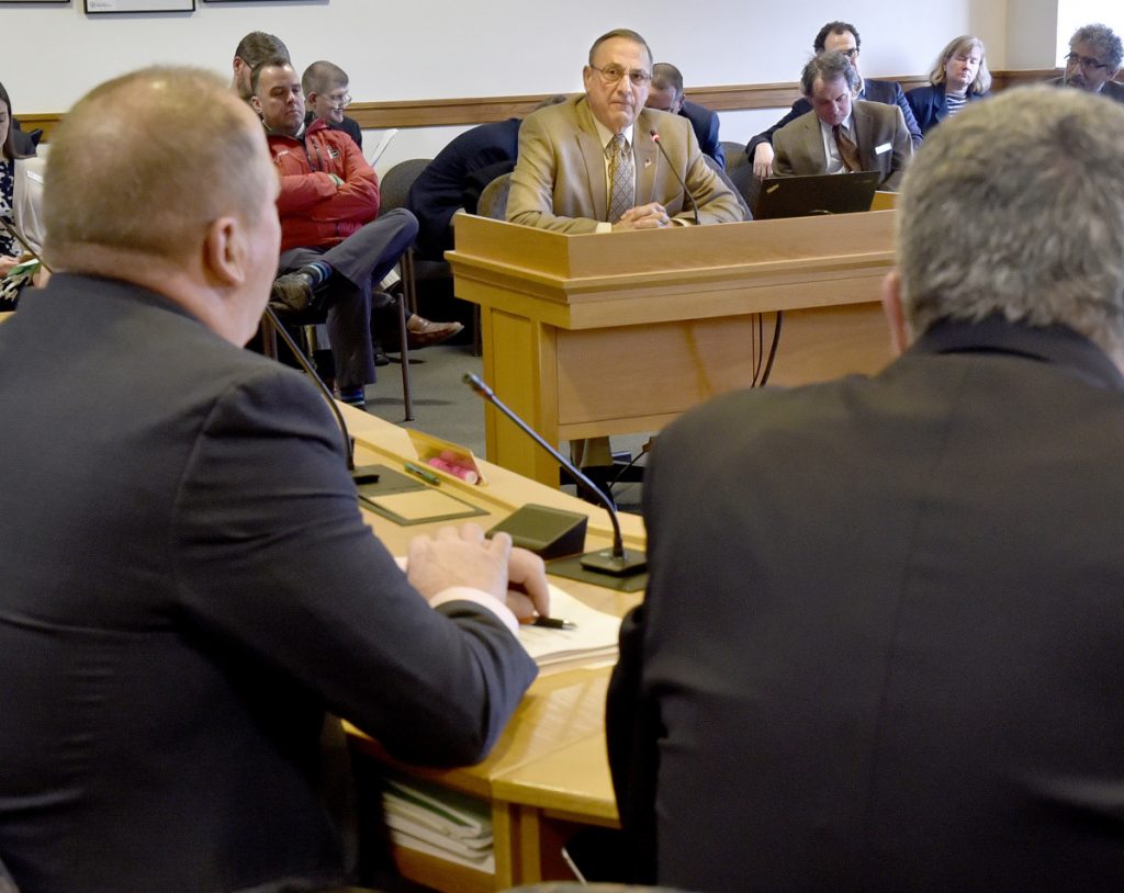 Gov. Paul LePage listens Tuesday during an appearance before the Joint Standing Committee on Taxation in support of L.D. 1629, a bill titled “An Act to Protect the Elderly from Tax Lien Foreclosures,” at the State House in Augusta. (David Leaming/Waterville Sentinel)
