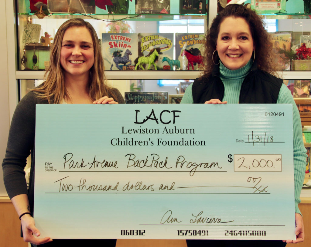 The Lewiston Auburn Children’s Foundation has begun awarding annual grants to local nonprofits. Liza Dimitri, vice president of the foundation, recently visited with Maggie Soule, director of the Park Avenue BackPack Program, to award a grant for $2,000 to the program. The program provides children with healthy, easy-to-prepare food during weekends and school vacations. Good Shepherd Food Bank partners with Park Avenue Elementary to discreetly provide children with bags filled with whole grains, fruits, vegetables and protein. Since 2010, the BackPack Program has grown to reach over 1,000 children and their families.