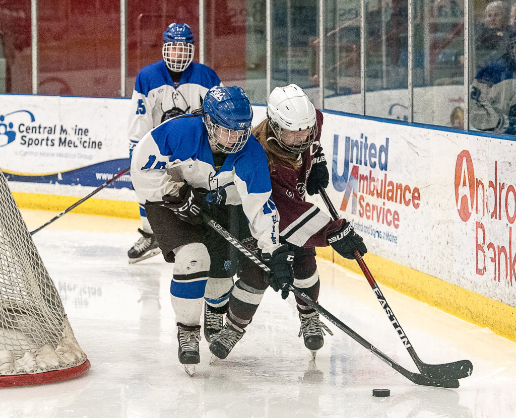 Lewiston/Monmouth/Oak Hill’s Gemma Landry scrambles with Greely/Gray-New Gloucester’s Bridget Roberts for control of the puck during Wednesday night’s north final at the Colisee in Lewiston. (Andree Kehn/Sun Journal)