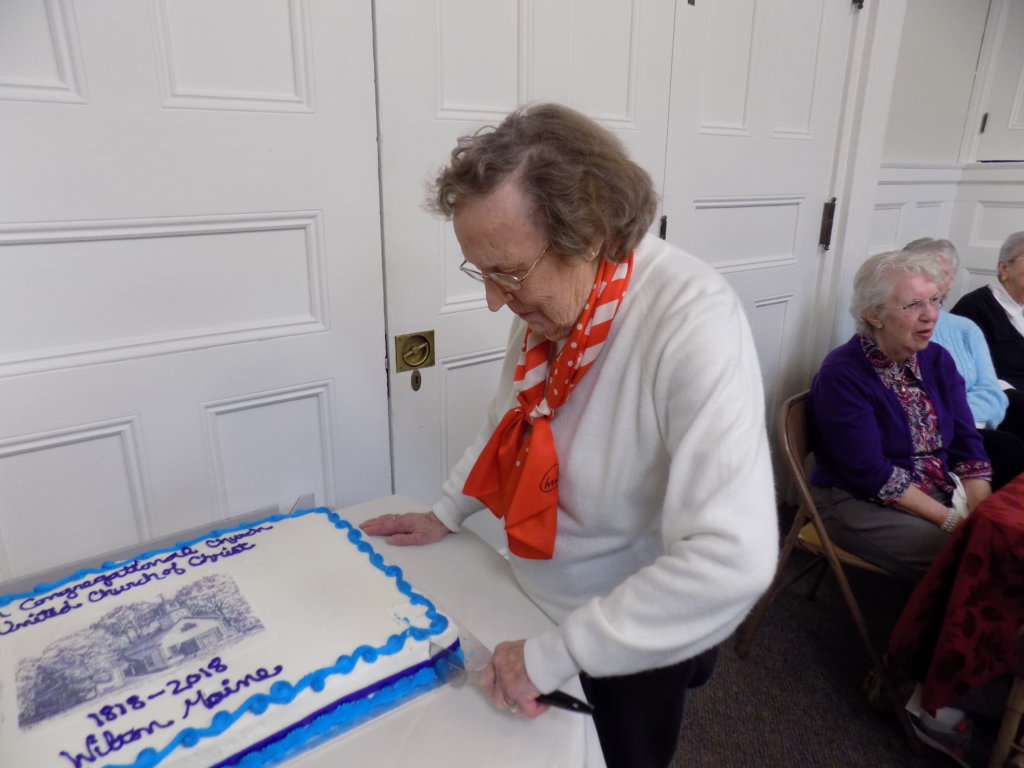 Ferna Girardin, 97, of Wilton cuts the bicentennial birthday cake at a celebration and dinner Friday night. She joined the church in 1959. (Pam Harnden/Livermore Falls Advertiser)