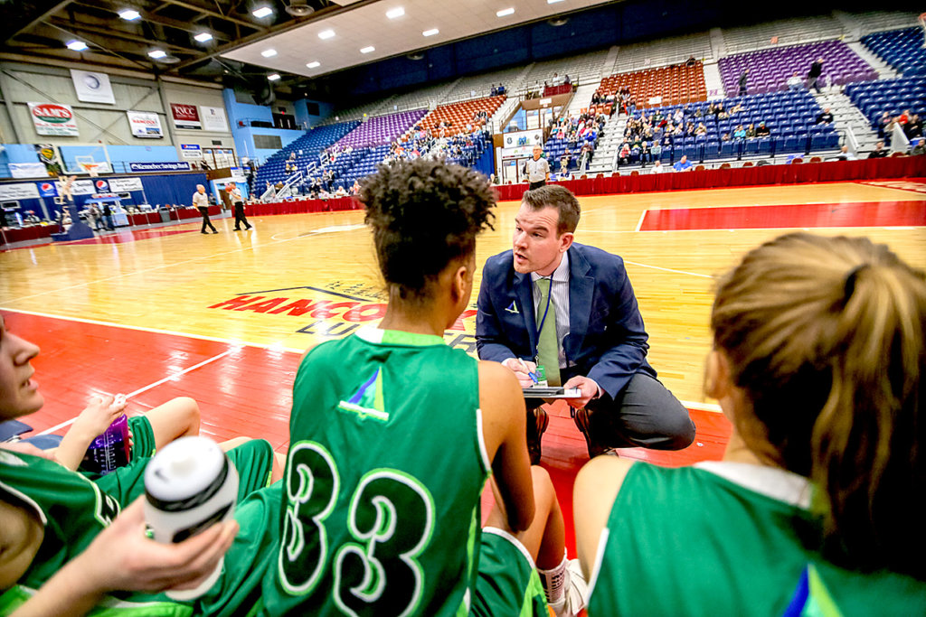 Pine Tree Academy head coach Josh Dayen draws up a play during a timeout during their Class D South quarterfinal at the Augusta Civic Center in Augusta on Monday. (Brewster Burns Photo)