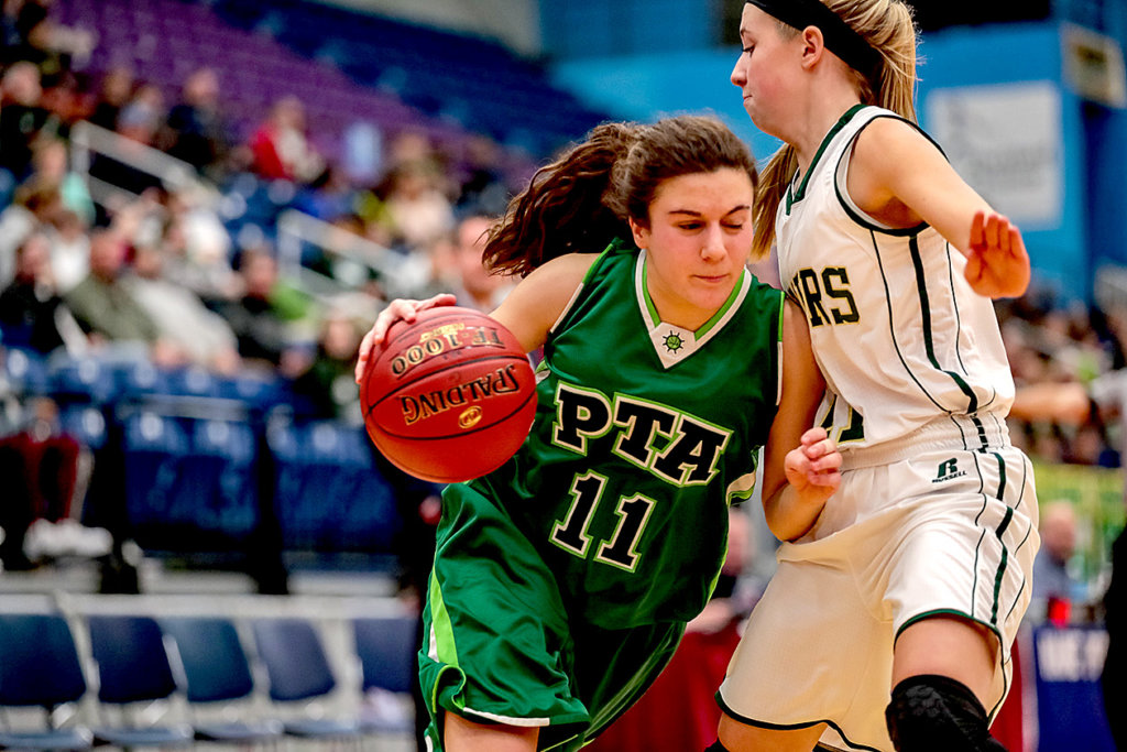 Rangeley’s Natasha Haley goes up against Pine Tree Academy’s Regence Sandy in the first half during their Class D South quarterfinal at the Augusta Civic Center in Augusta on Monday. (Brewster Burns Photo)