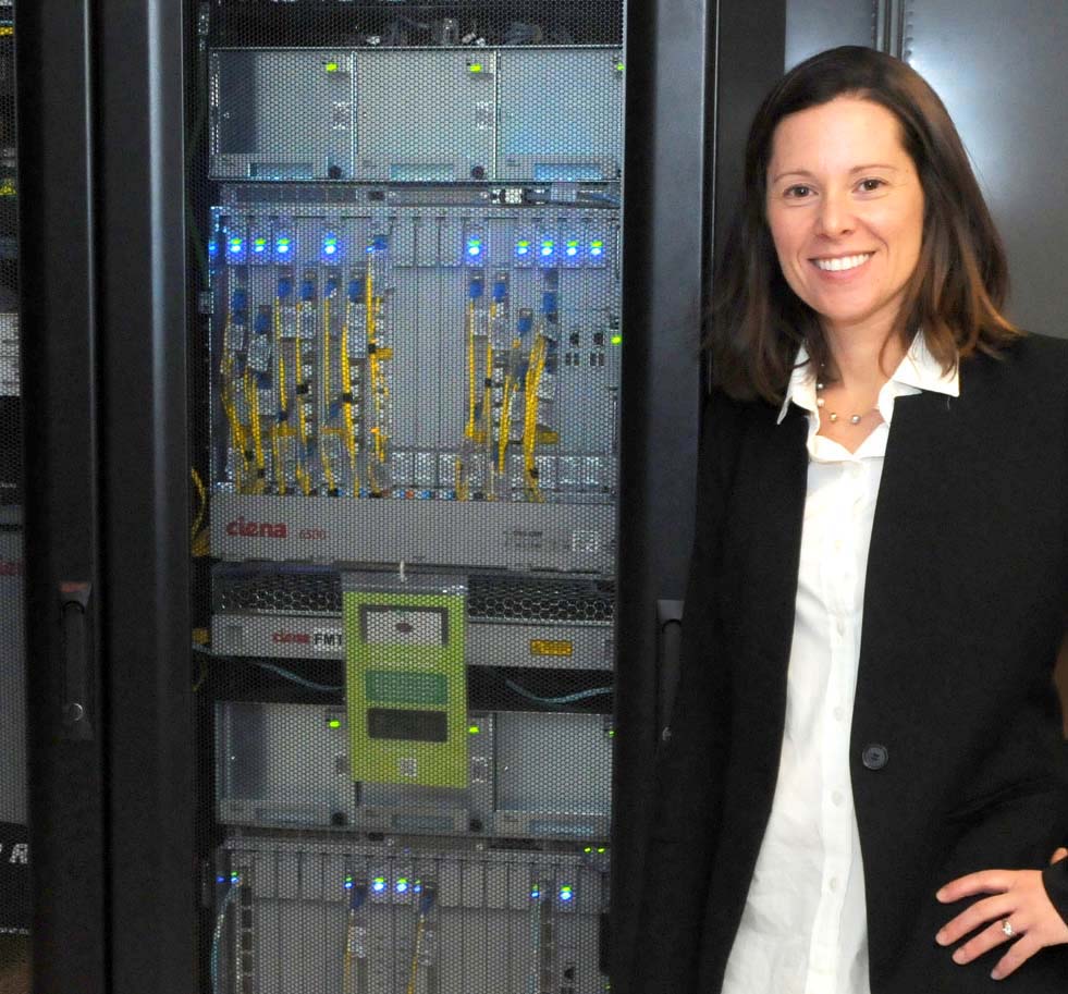 Meredith Swallow, UMF assistant professor of elementary education, is standing near one of the servers located on the UMF campus.