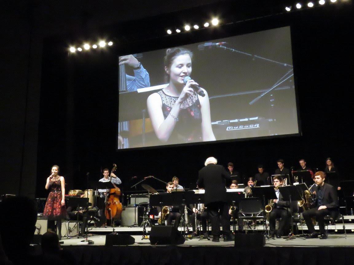Fryeburg Academy junior Georgia Stafford performs at the evening awards ceremony with the Berklee Concert Jazz Orchestra directed by Greg Hopkins.