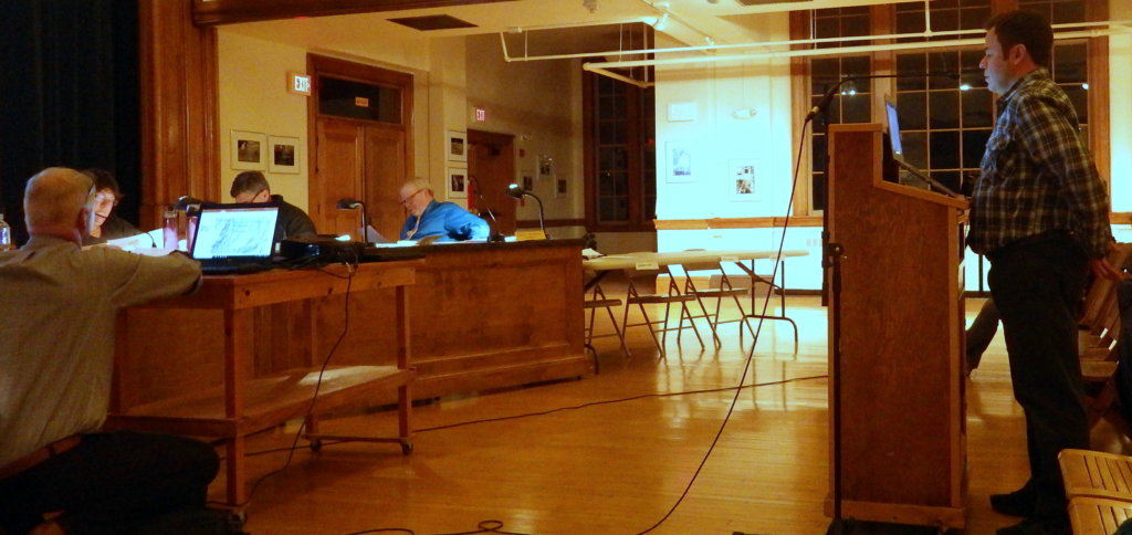 Poland Spring Natural Resource Manager Mark Dubois addresses selectmen March 1 on the company’s progress in installing test wells in Rumford. The company has a 15-year contract to extract 150 million gallons of water per year from Rumford Water District wells. (Bruce Farrin/Rumford Falls Times)