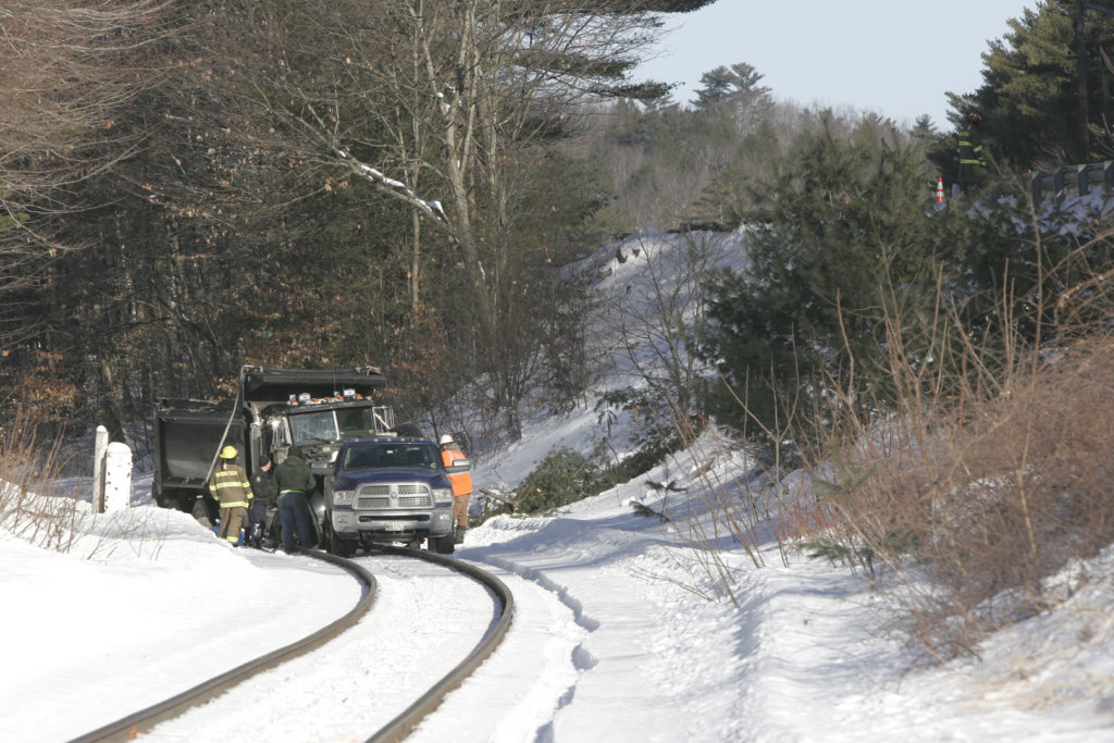 The driver of a dump truck escaped injury Monday morning when his vehicle rolled down an embankment and landed on the the tracks of the St. Lawrence & Atlantic Railroad in Bryant Pond. According to Oxford County Sheriff’s Dept. Deputy Josh Daley, Jeffrey Robidoux, 50, of Woodstock was traveling south on Route 26 about 7 a.m. when the crash happened. Daley said Robidoux said the steering wheel locked up on the 2004 Peterbilt truck as he approached a slight corner near the town baseball field. The truck then went through the guardrail and rolled over once, landing upright on the tracks. Robidoux, who was wearing a seatbelt, was able to get out of the vehicle, said Daley. He was checked by PACE ambulance. Also responding to the scene was the Woodstock Fire Department and troopers from the Maine State Police Commercial Vehicle Division. Daley said they would examine the mechanics of the truck, which Daley said he believed will be a total loss. While there appeared to be no visible damage to the train tracks, St. L&A personnel were also at the scene to inspect them before train traffic resumes. The truck was expected to be removed from the tracks by winching, Daley said. (Alison Aloisio/The Bethel Citizen)