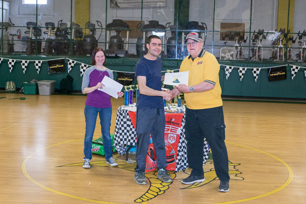 Eric St. Pierre is congratulated on his first-place finish in the heavyweight class of the Pinewood Derby at Oxford Hills Middle School in Paris on March 3. Announcer Jerry Major of Norway hands him his certificate as derby organizer Rebekah Arnsten watches. (Submitted photo)