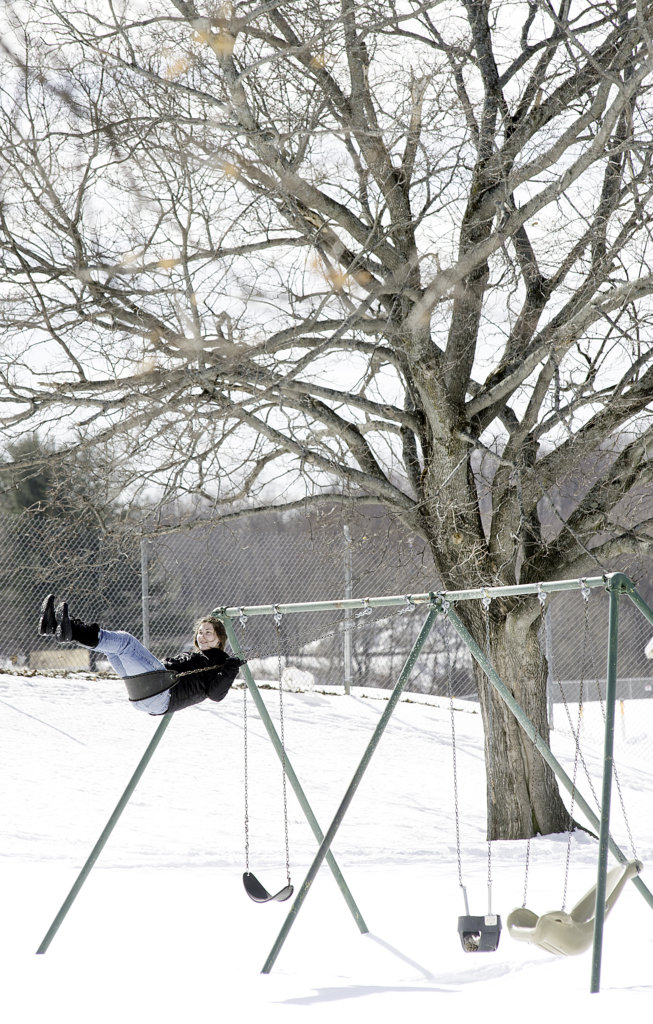 Trinity Robitaille swings in Marcotte Park in Lewiston on Friday. She said she is spending time in her favorite park before the next big storm makes it impossible to get to. “This is my little spot,” she said. More snow is expected Wednesday. (Daryn Slover/Sun Journal)