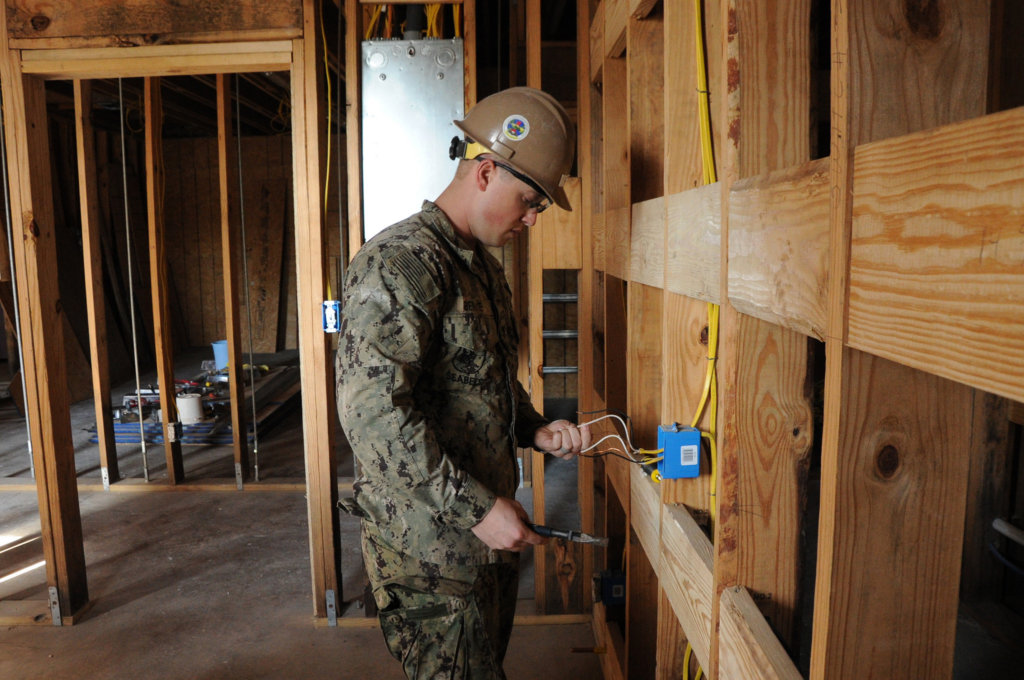 Construction Electrician 3rd Class Tyler Benvie of Porter runs electrical wire at the Wiggins Irregular Training Project, Wiggins, Mississippi, on March 13. NMCB 1 is a Seabee Battalion specializing in contingency construction, disaster response, humanitarian assistance and combat operations support. (U.S. Navy photo by Mass Communication Specialist 3rd Class Alexa Trafton)