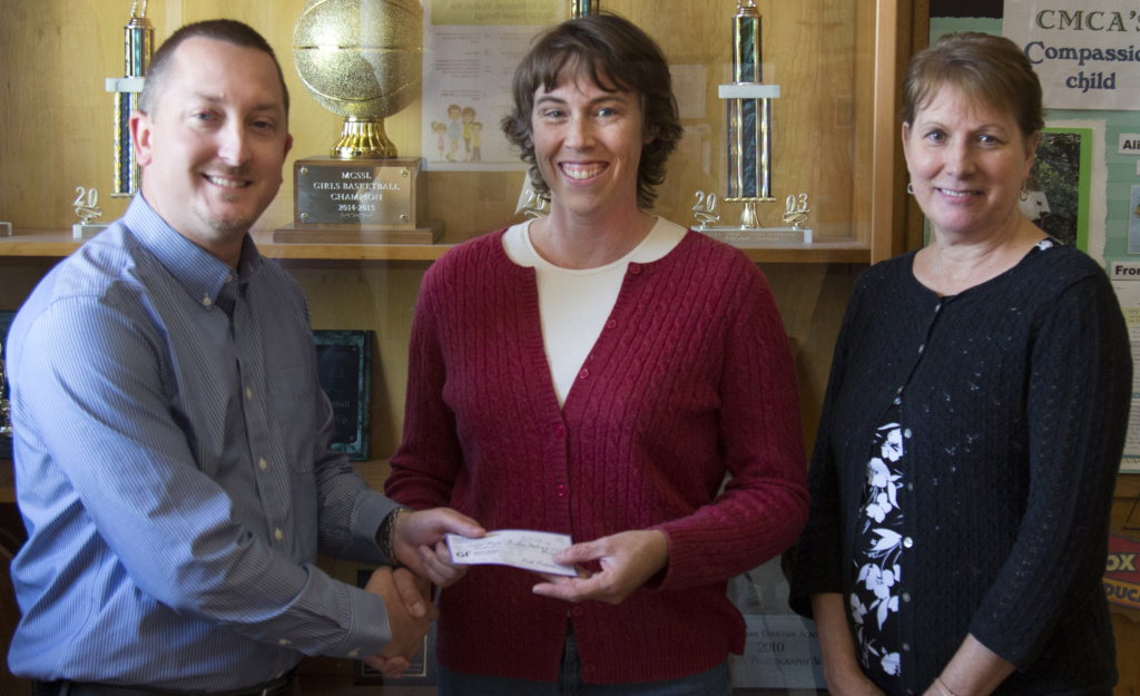Pastor David Poisson, left, of New Life Stevens Mills Church presents Amy Drake, center, the $500 Christian education scholarship. Also pictured is Pat St. Hilaire, administrator of Central Maine Christian Academy. New Life will award two $500 scholarships for school year 2018-2019. Applications will be available through May.