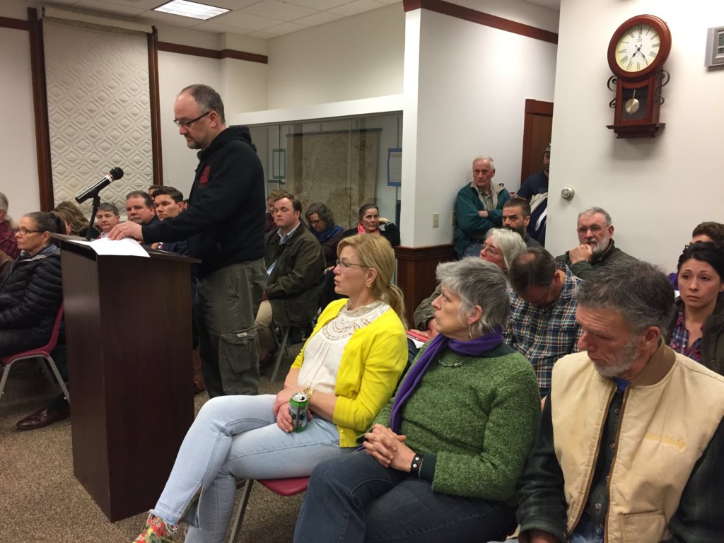 Michael Rawlings-Sekunda of New Gloucester speaks at Wednesday night’s public hearing by the New Gloucester Board of Appeals on a proposed residential treatment facility in a residential neighborhood on Intervale Road. (Matt Junker/The Forecaster)