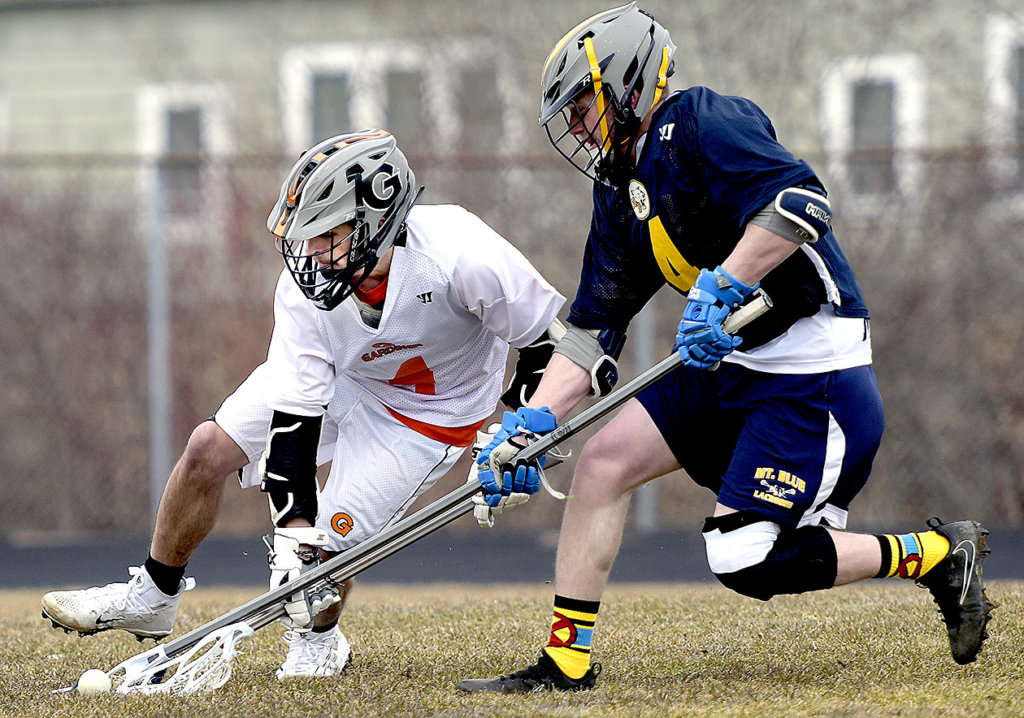Gardiner Area High School’s Nathan Phillis, left, collects the ball from under Mt. Blue High School’s Matt Hyde during a lacrosse match Thursday in Gardiner. (Andy Molloy/Morning Sentinel)