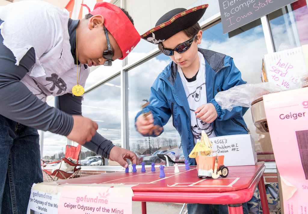 Geiger Elementary School fourth-graders Cole Ridley, left, and Enzo Giampaolo work through their skit on a scale model of their production for a customer leaving Marden’s in Lewiston on Wednesday. The Lewiston students are members of an Odyssey of the Mind team that qualified for the World Finals to be held in Ames, Iowa, on May 23-27. The other members of the team are Lucy Huggett, Arianna Hudon and Austin Landry. The team’s fundraising site is https://tinyurl.com/ydyf3rau. (Russ Dillingham/Sun Journal)