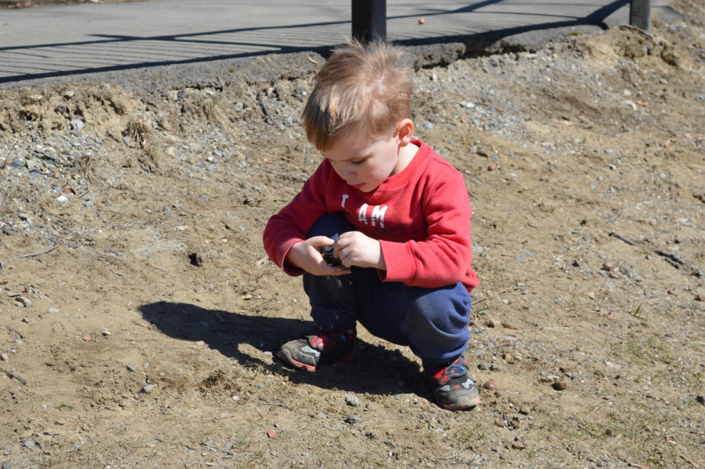 Ian House, 2, of Farmington fills the bed of his toy truck with dirt on Monday at Meetinghouse Park in Farmington. (Donna M. Perry/Sun Journal)