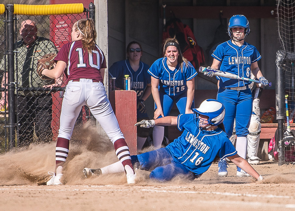 Lewiston’s Jordan Mynahan slides into home base for the run as Edward Little’s Hannah Smith fails to tag her out during Monday afternoon’s matchup at Bates College. (Andree Kehn/Sun Journal File Photo)