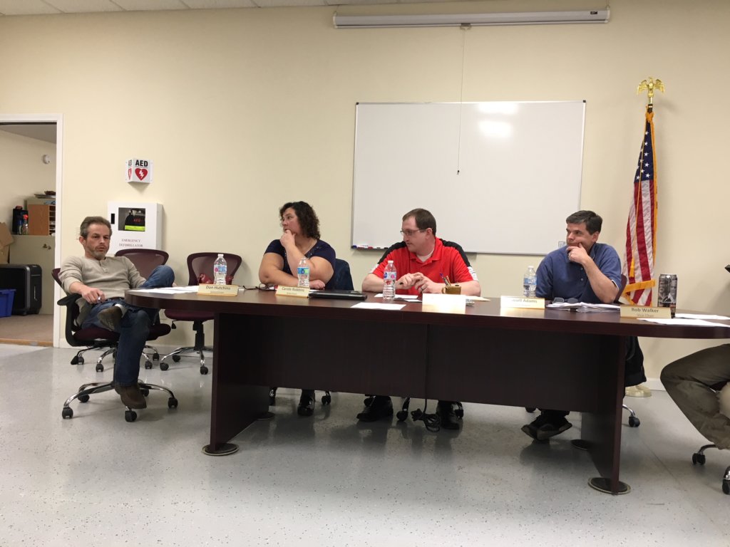 Canton selectmen, from left, Don Hutchins, Carole Robbins, Chairman Brian Keene and Russell Adams meet Thursday. Not pictured is Selectman Rob Walker. (Marianne Hutchinson/Rumford Falls Times)