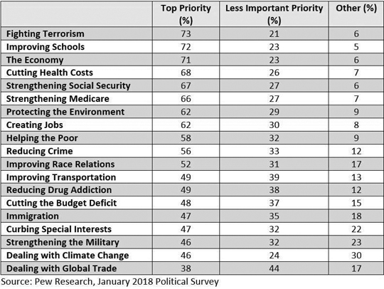 There are 19 public priorities that Pew asked about in the January poll. Dealing with climate change ranked next to last. Fighting terrorism was first. The “other” category includes priorities that are opposed or considered not important.