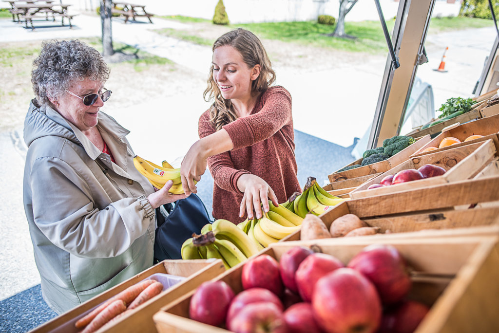 Carole Hanscombe gets help breaking up a bunch of bananas at the Good Food Bus from Kathleen McKersie after one of her senior college classes at the University of Southern Maine’s Lewiston-Auburn College on Tuesday. McKersie, who works for the Good Food Bus, said sales of their anchor meals, a pre-portioned vegetarian meal, have been especially brisk. Regular tours of the Good Food Bus start officially in mid-June, but it made a special appearance to get fruits and vegetables to students taking finals. (Andree Kehn/Sun Journal)