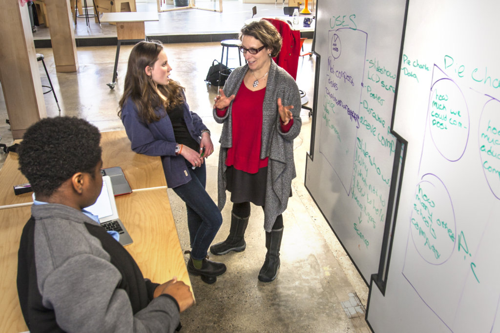 What does 21st century learning look like now? And what is a “maker space?” The landscape of learning is challenged to be “agile” and “nimble” and “experiential.” But what does that really mean for the student learner and the learning environment? Sara Shifrin, director of Gould’s Marlon Family IDEAS Center, will talk about the trends at 4:30 p.m. Tuesday, May 8, in Alumni Auditorium in Gould Academy’s McLaughlin Science Building in Bethel. This is the second presentation in Western Mountains Senior College’s 2018 Down Home Maine series. DHM presentations are free and open to the public. Students Wyman Ward, left, and Mia Shifrin, center, speak with Shifrin, right, in Gould Academy’s Marlon Family IDEAS Center.
