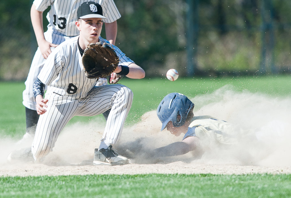 Traip’s Charlie Driscoll slides head first into second with a stolen base before the ball gets to Saint Dominic’s Hunter Hughes during Friday afternoon’s game in Auburn. (Russ Dillingham/Sun Journal)