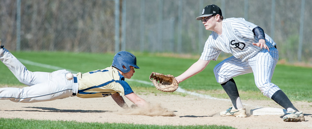 Traip’s Charlie Driscoll slides back to first before Saint Dominic first baseman Riley Volpe can tag him out during Friday afternoon’s game in Auburn. (Russ Dillingham/Sun Journal)