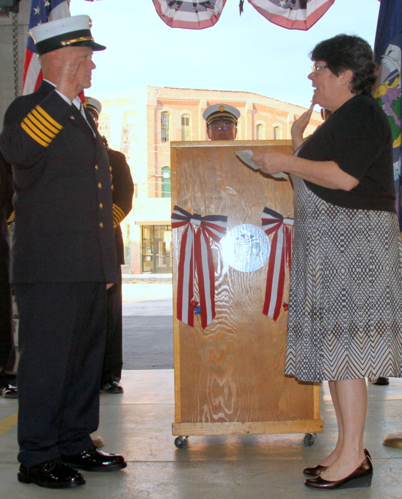 Incoming Rumford Fire Chief Chris A. Reed takes the oath of office from Town Manager Linda-Jean Briggs during a pinning ceremony Thursday evening at the fire station. (Bruce Farrin/Rumford Falls Times)