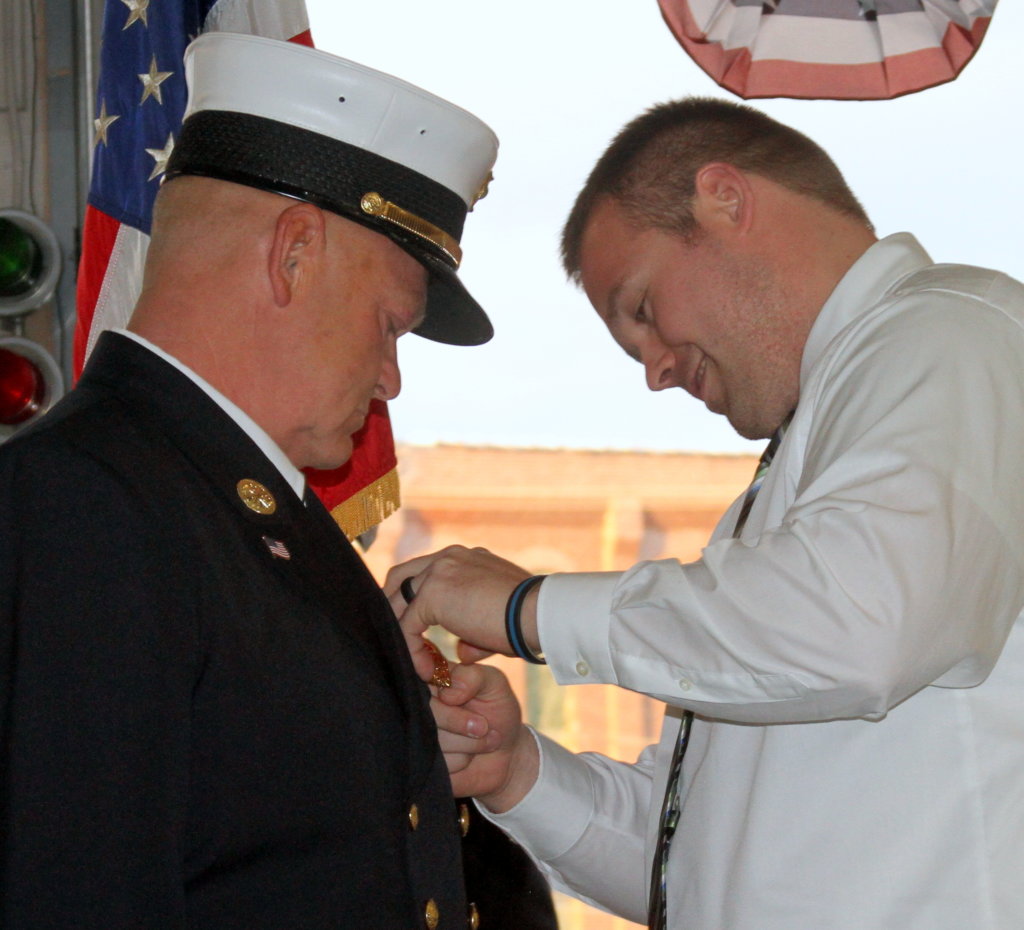Luke Reed pins the fire chief”s badge on his father, Chris A. Reed, at the Rumford fire station Thursday night. (Bruce Farrin/Rumford Falls Times)