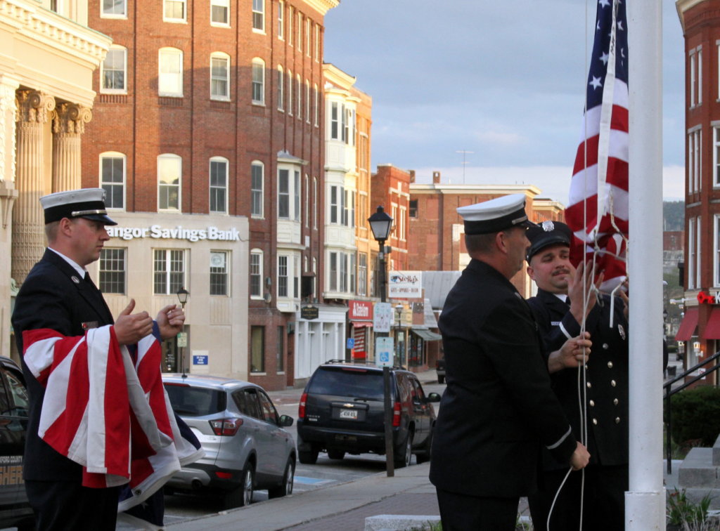 Rumford firefighters, from left, Lt. Mike Arsenault, Lt. Keith Bickford and Pvt. Ray Crockett replace the American flag outside the fire station Thursday evening. (Bruce Farrin/Rumford Falls Times)