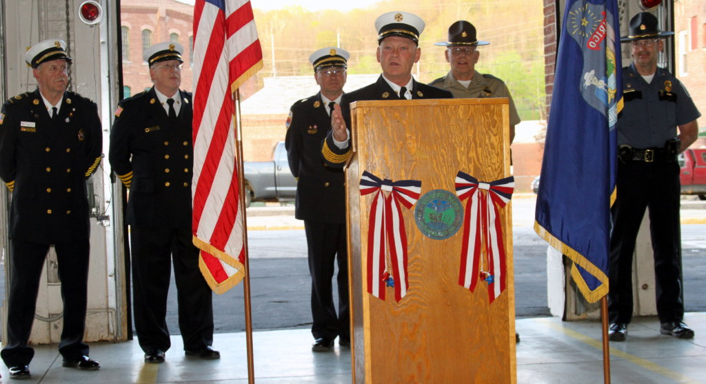 New Rumford Fire Chief Chris A. Reed addresses the audience following a pinning ceremony Thursday evening at the fire station. Behind him, from left, are Mexico Fire Chief Richard Jones, Dixfield Fire Chief Scott Dennett, Peru Fire Chief Bill Hussey, Oxford County Sheriff James Theriault and Rumford Police Chief Stacy Carter. (Bruce Farrin/Rumford Falls Times)