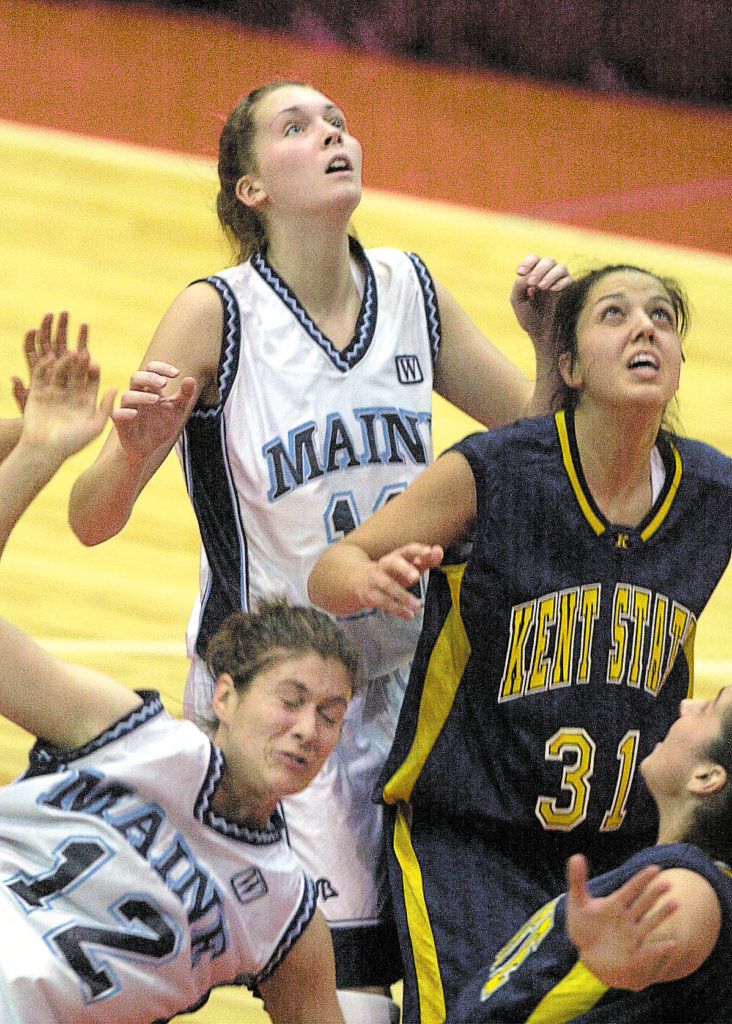 Heather Ernest, top, and her University of Maine teammate Tracy Guerrette, left, battle under the hoop against Kent State’s Valerie Zona in 2001.
