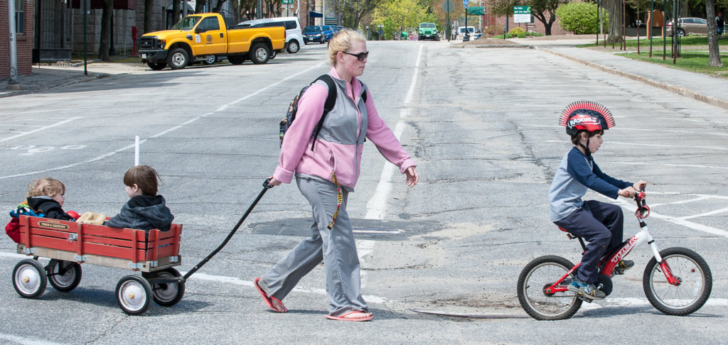 Jessica Sullivan pulls her sons Jayden Buckley, far left, and Ryder Buckley as another son, Robert Buckley, right, leads them across Park Street in Lewiston on Saturday afternoon as they make their way home from visiting a friend in Auburn. (Russ Dillingham/Sun Journal)